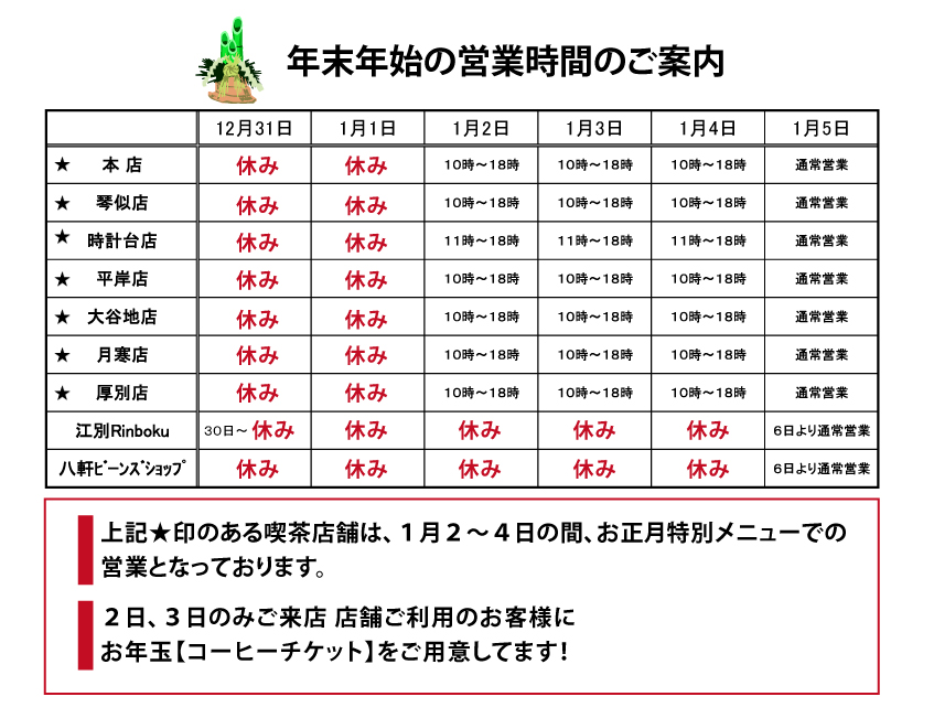 年末年始の直営店舗 営業時間のお知らせ